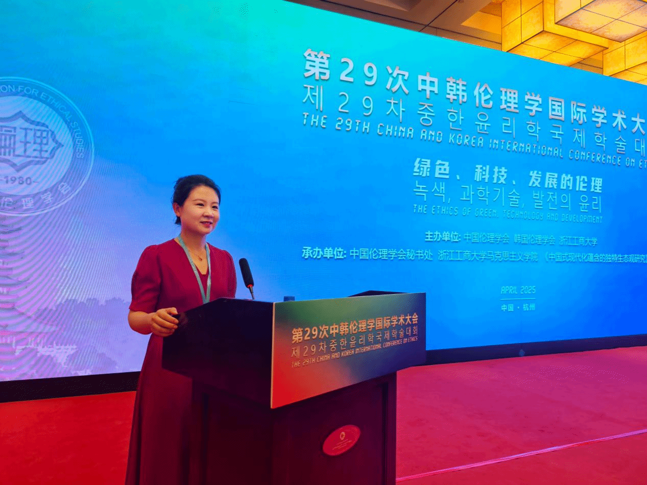 (通讯员:王法睿)2025年4月18日至20日,第29次中韩伦理学国际学术大会在杭州召开。会议由中国伦理学会、韩国伦理学会、浙江工商大学共同主办,主题为“面向未来:绿色、科技、发展的伦理”。来自国内和韩国、奥地利、美国的380多位学者参加了此次盛会。U8国际官网教师韩天澍受邀参加并在分论坛研讨会中发言。