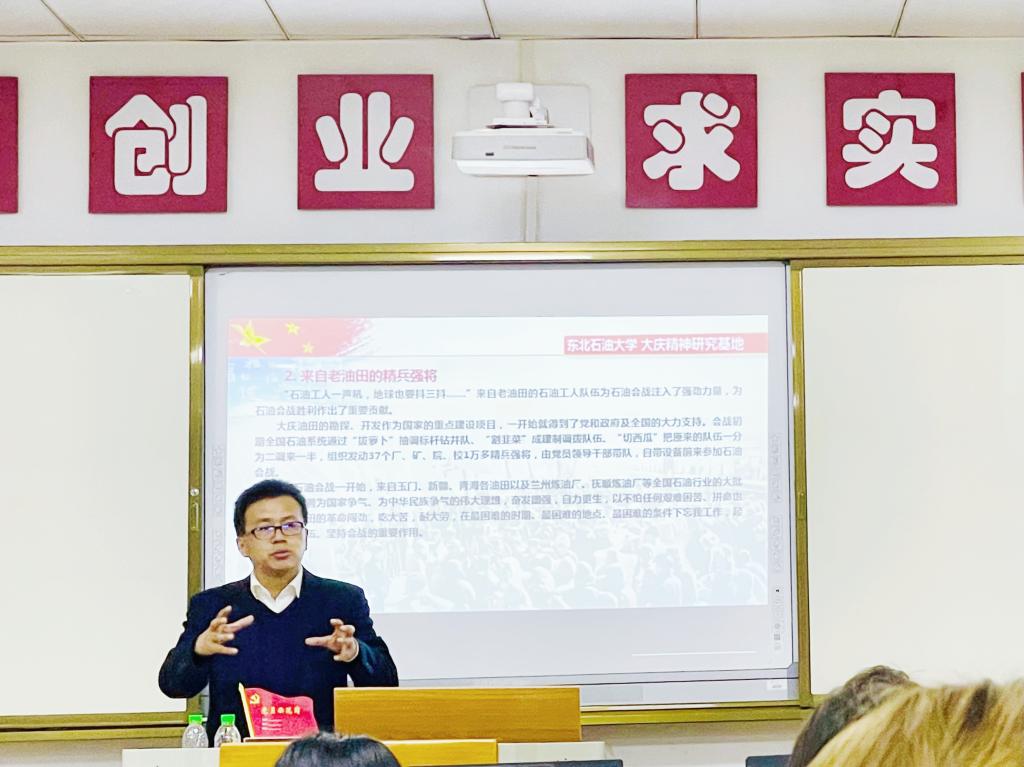 首先,李万鹰从大庆精神形成的时代背景、实践基础和理论来源出发,通过讲述铁人带伤勇跳泥浆池、万里测油温、五把铁锹闹革命等三代铁人的感人故事,生动解读了大庆精神“为国争光、为民族争气的爱国主义精神,独立自主、自力更生的艰苦创业精神,讲求科学、‘三老四严’的求实精神,胸怀全局、为国分忧的奉献精神”的深刻内涵。随后,李万鹰立足大庆精神的历史地位及时代价值回答了新时代弘扬大庆精神的意义所在,肯定了大庆油田在中华民族历史上的伟大贡献和大庆精神铁人精神的标杆旗帜作用。最后,李主任总结:大庆精神铁人精神是中华民族精神的的重要组成部分,是中国共产党的伟大精神,作为新时代的思政课教师和青年员工,我们要大力继承和弘扬大庆会战的优良传统,积极学习研讨《矛盾论》《实践论》,学习“三老四严”、“四个一样”、“三要十不”等优良传统,学以致用,弘扬爱国奋斗精神,建功立业新时代。