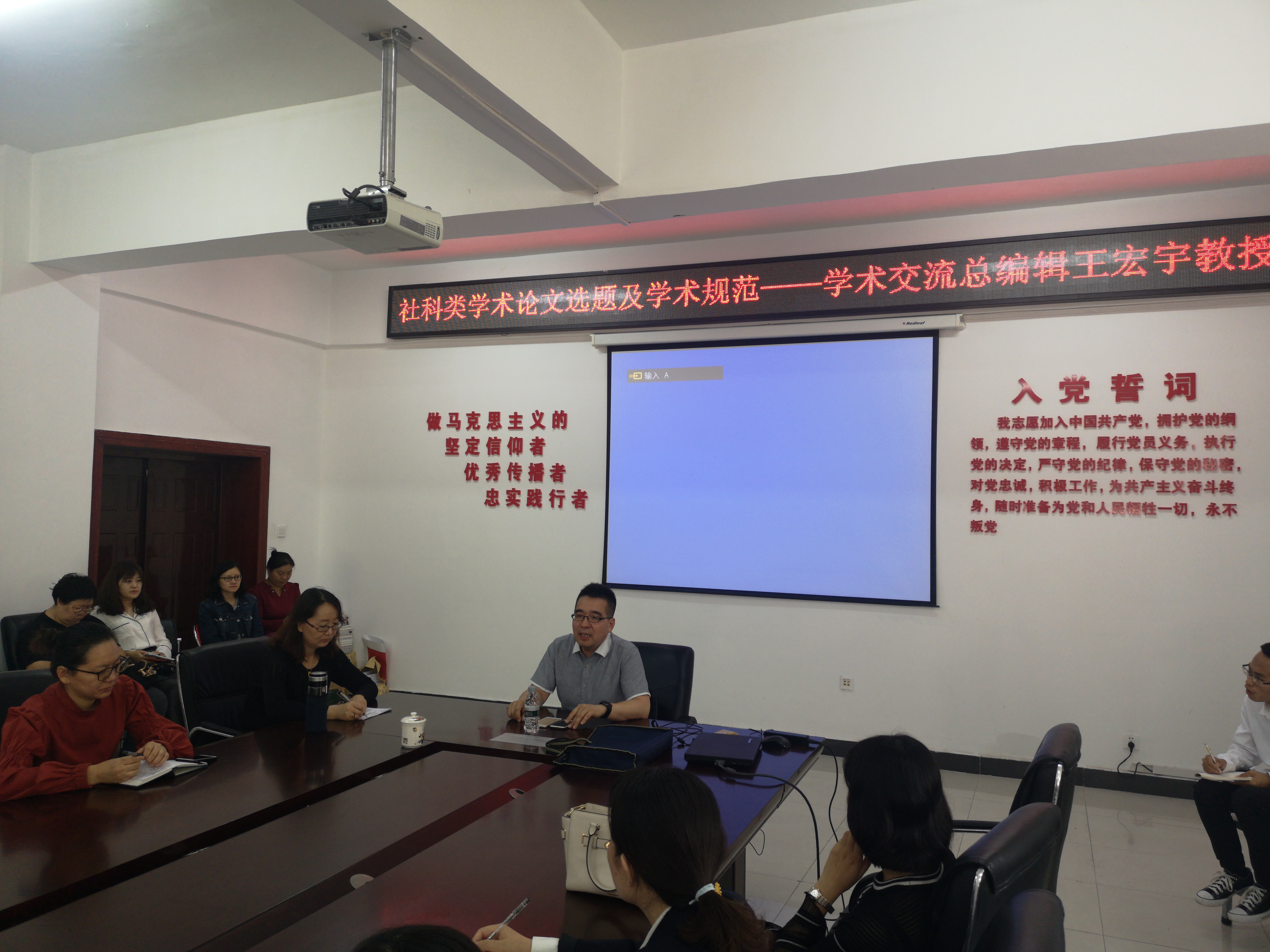 王宏宇教授分别从青年教师研究方向的确定、社科类学术论文的选题要素、社会价值、写作重点难点、学术规范等方面剖析了如何写出一篇好的学术论文,并从投稿注意事项等方面逐一对青年教师及研究生进行指导,王宏宇教授内容丰富、生动、具体的讲座赢得了聆听者的阵阵掌声。讲座结束后,王教授与青年教师、研究生进行了问答交流。