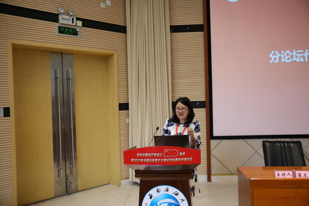 闭幕式上,公司青年教师李晶晶代表所在的分论坛进行总结发言,对小组教师的讨论情况进行了总结,并深入阐释了参加此次论坛的收获。她认为,青年教师要守正创新、正本清源,要通过党史学习推动思想政治理论课的教学。青年强,学科强,青年教师要承担好马克思主义理论团队建设的任务。