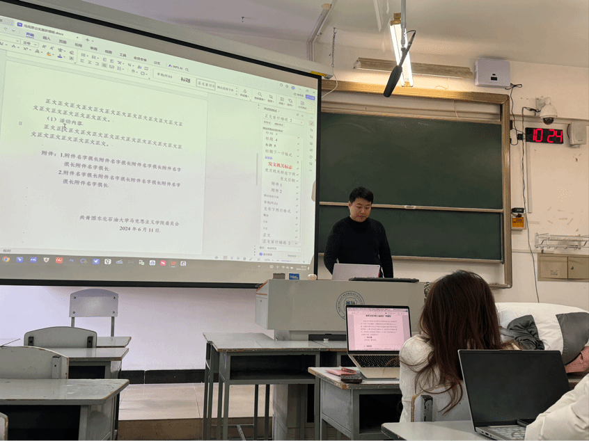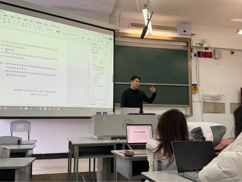 活动伊始,团委副书记苏欣在带领大家回顾首次培训中讲授的公文知识的基础上,进一步详细讲解了公文的标准格式和注意事项。他通过深入剖析实际工作中可能遇到的公文问题,帮助参会成员厘清写作思路,并以实例演示的形式,将复杂的理论知识化繁为简,使大家更易掌握。随后,为了强化学习效果,他组织成员进行互动讨论,针对不同类型的公文实例进行分析和点评。最后,苏欣再次强调了熟悉公文写作要求和熟练运用办公软件的重要性,希望员工组织成员们能够将培训活动中学习到的公文知识在理论与实践方面融会贯通,以便日后进行熟练操作,也希望通过此次培训后员工组织各部门的日常工作更加有序高效。